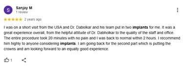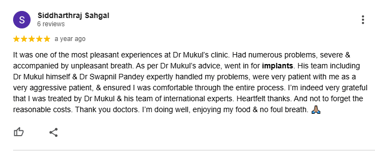 "I landed in Mumbai in excruciating pain during a wedding trip, and Dr. Mukul saw me immediately, diagnosed a severe abscess, and coordinated emergency care with a specialist. Within 48 hours, the agony was gone, and I was blown away by the care, compassion, and professionalism throughout. The final crowns were flawless — easily matching, if not exceeding, the dental work I've had in the UK and US."